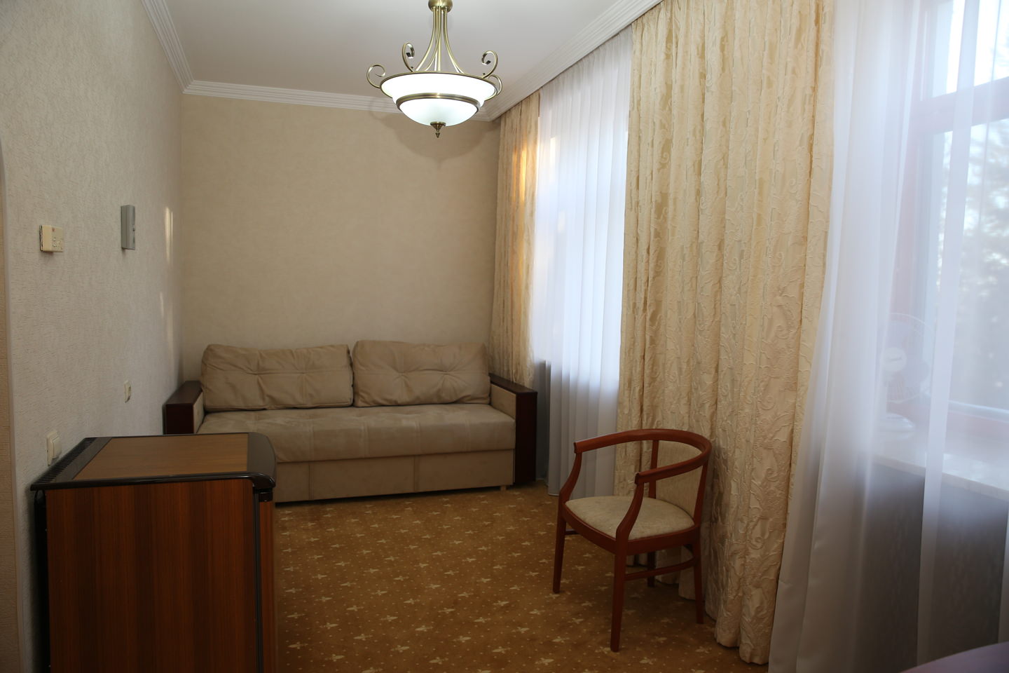 Площадь номера - 30 кв.м. 1 осн. место. 3 доп. места. Мебель: вешалка, диван раскладной, зеркало, ковровое покрытие, кровать двуспальная, прикроватные тумбочки, столик туалетный, стул, шкаф. Оборудование: мини-холодильник, пляжные полотенца, сейф, телевизор ЖК, телефон, чайный набор посуды, электрочайник. Санузел: с ванной, туалетные принадлежности, фен. Сервис: смена полотенец, смена постельного белья, уборка номера.