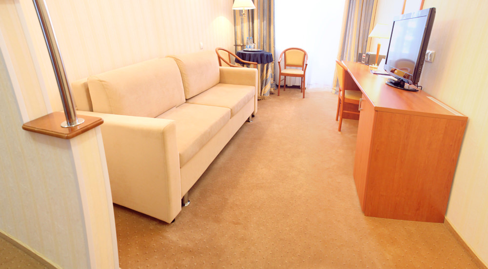 Площадь номера - 30 кв.м. 2 осн. места. 2 доп. места. Балкон. Мебель: вешалка, диван раскладной, зеркало, ковровое покрытие, кровать двуспальная, прикроватные тумбочки, стол, столик журнальный, стулья, шкаф. Оборудование: мини-холодильник, пляжные коврики, сейф, телевизор ЖК, телефон, чайный набор посуды, электрочайник. Санузел: с ванной, тапочки, туалетные принадлежности, фен, халат. Сервис: смена полотенец, смена постельного белья, уборка номера.