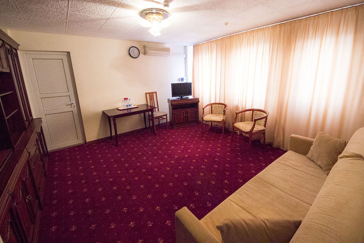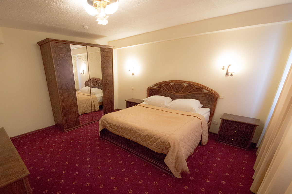 Площадь номера - 45 кв.м. 2 осн. места. 2 доп. места. Мебель: диван раскладной, зеркало, ковровое покрытие, кровать двуспальная, прикроватные тумбочки, стол, столик журнальный, стулья, шкаф. Оборудование: мини-холодильник, пляжные полотенца, сейф, телевизор, телефон, чайный набор посуды, электрочайник. Санузел: с ванной или душевой кабиной, тапочки, туалетные принадлежности, фен. Сервис: смена полотенец, смена постельного белья, уборка номера.