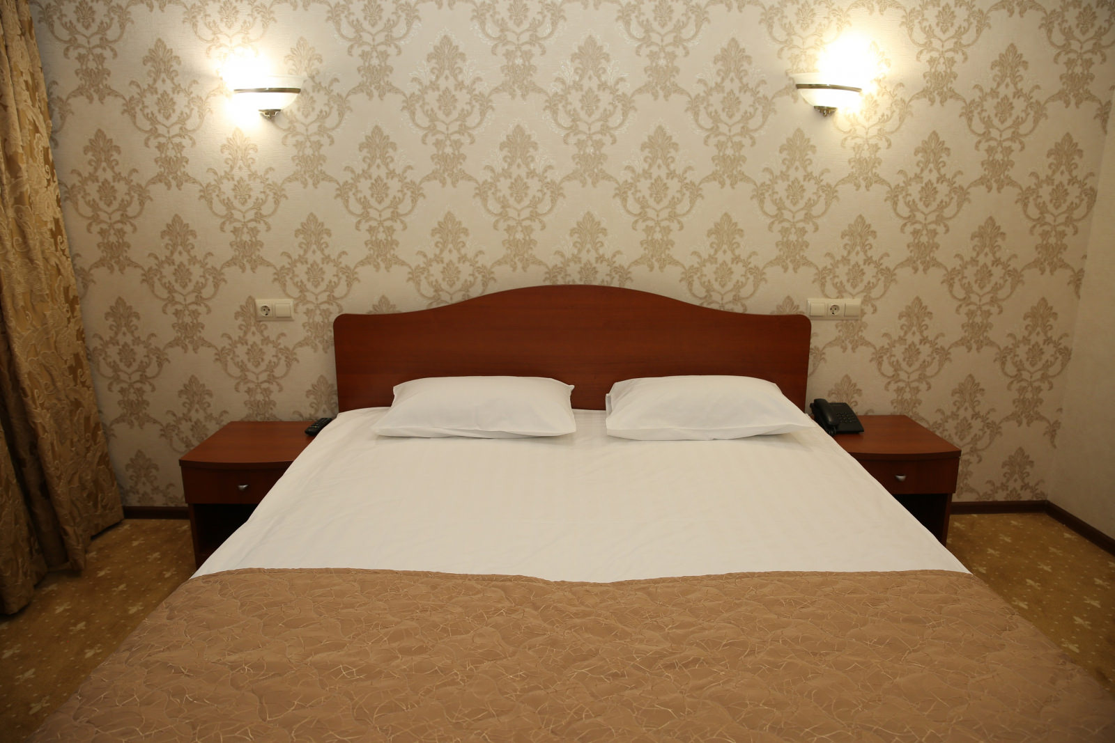 Площадь номера - 20 кв.м. 1 осн. место. 2 доп. места. Мебель: вешалка, зеркало, ковровое покрытие, кровать двуспальная, прикроватные тумбочки, столик туалетный, стулья, шкаф. Оборудование: мини-холодильник, сейф, телевизор ЖК, чайный набор посуды, электрочайник. Санузел: с душем, туалетные принадлежности, фен. Сервис: смена полотенец, смена постельного белья, уборка номера.