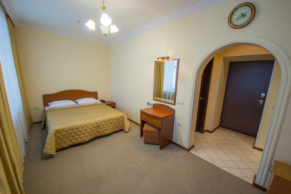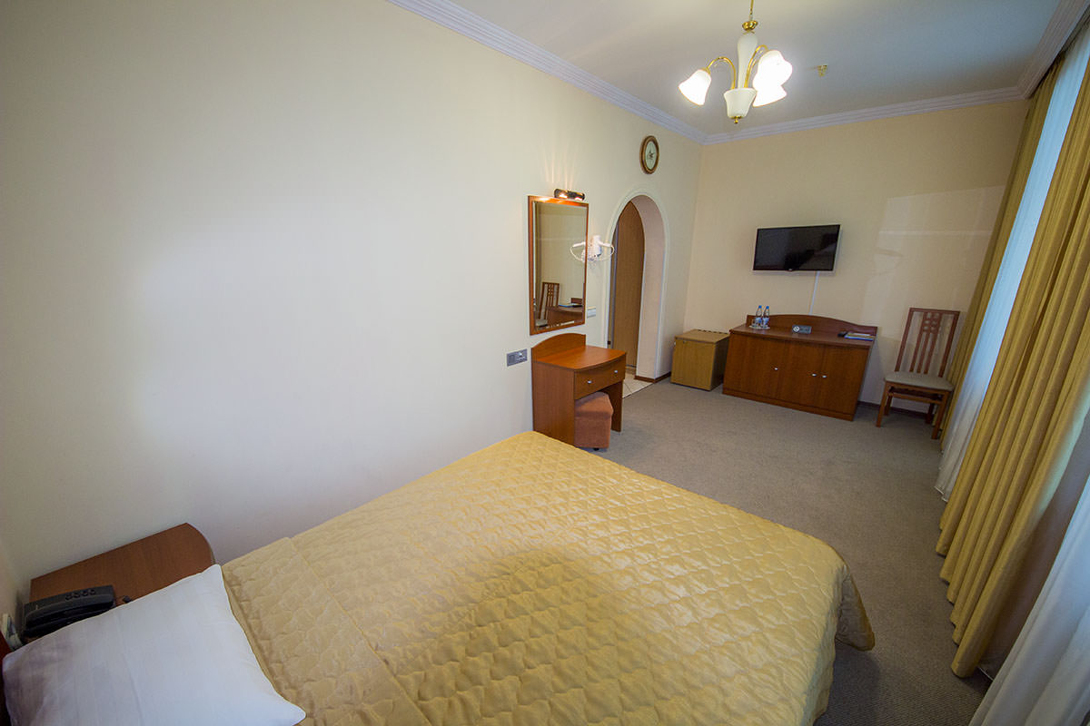 Площадь номера - 22 кв.м. 1 осн. место. 2 доп. места. Балкон. Мебель: вешалка, зеркало, ковровое покрытие, комод, кровать двуспальная, прикроватные тумбочки, столик туалетный, стул, шкаф. Оборудование: мини-холодильник, пляжные полотенца, сейф, телевизор ЖК, чайный набор посуды, электрочайник. Санузел: с душем, туалетные принадлежности, фен. Сервис: смена полотенец, смена постельного белья, уборка номера.