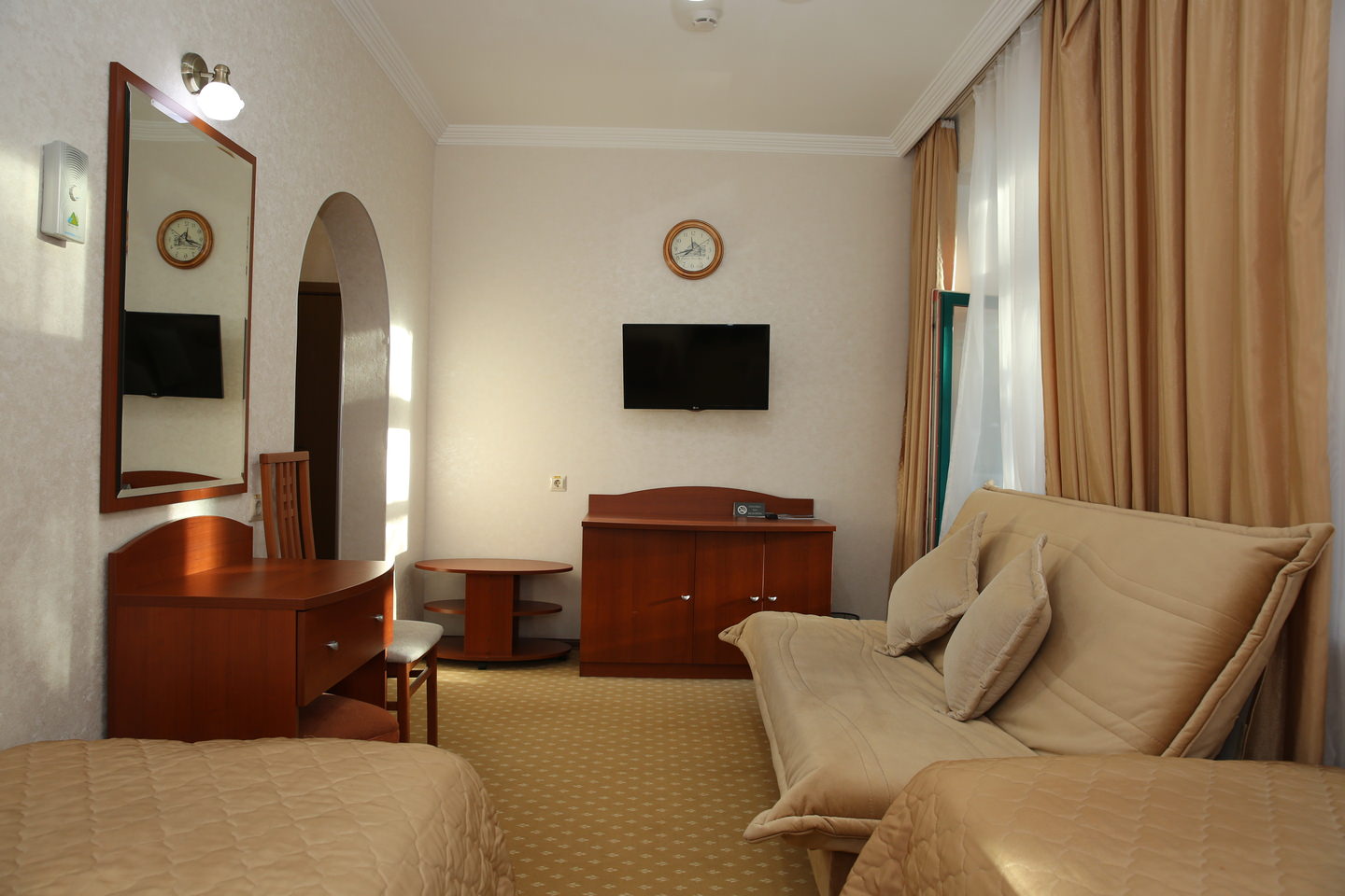 Площадь номера - 20 кв.м. 2 осн. места. 2 доп. места. Мебель: вешалка, диван раскладной, зеркало, ковровое покрытие, кровати односпальные, прикроватные тумбочки, стол, столик туалетный, стул, тумба, шкаф. Оборудование: мини-холодильник, пляжные полотенца, сейф, телевизор ЖК, телефон, чайный набор посуды, электрочайник. Санузел: с душем, туалетные принадлежности, фен. Сервис: смена полотенец, смена постельного белья, уборка номера.